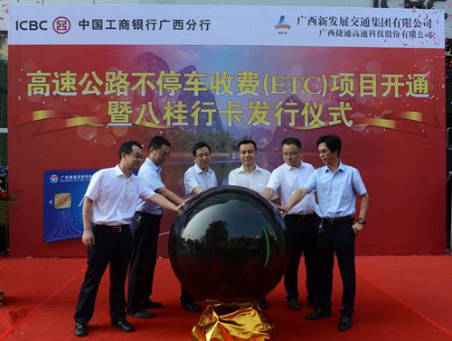 劉明洪在致辭中表示,早在今年3月份,工行就成為廣西首批入圍ETC項(xiàng)目的合作銀行,雙方成功簽署了ETC項(xiàng)目合作協(xié)議,并取得了豐碩的合作成果,此次儀式正式啟動(dòng),標(biāo)志著雙方合作邁上一個(gè)全新的高度。集團(tuán)公司將不斷推進(jìn)ETC業(yè)務(wù)市場拓展,未來ETC將不只限于高速公路收費(fèi),還會(huì)不斷向加油站、停車場、城市小區(qū)、普通公路等相關(guān)領(lǐng)域延伸。