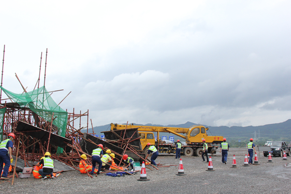 支架坍塌事故假想地點(diǎn)位于賀州至巴馬高速公路(鐘山至昭平段)新竹立交橋,假設(shè)工人在施工作業(yè)時,新竹立交橋支架突然坍塌,導(dǎo)致四名作業(yè)人員被困,其中一名被壓在鋼管下已昏迷,另一個工人手臂大量出血,其余兩個輕傷。