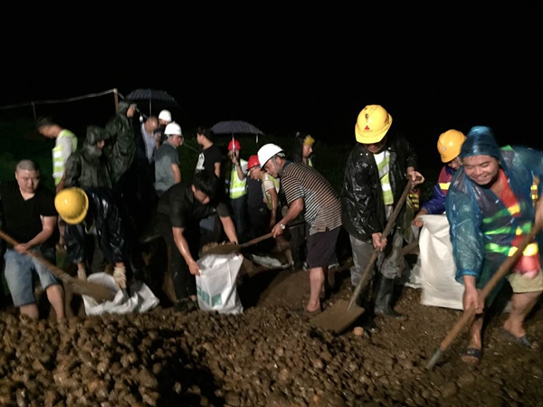 “十萬壟大堤出現(xiàn)險情,大家快去救援?!?月1日21時,湖南省湘潭市,廣西路橋集團環(huán)東路項目經(jīng)理部項目常務(wù)副總工程師宋佩超立即組織項目經(jīng)理部員工一起奔赴一線。當(dāng)時湘潭市十萬壟湘江大堤出現(xiàn)直徑約20公分左右管涌,情況十分緊急,附近的新馬路項目部出動挖掘機和裝載機進行搶險救援。同時,項目經(jīng)理部全體員工與當(dāng)?shù)鼐仍犖橐黄鹋牌鹆碎L龍,齊聲喊著口號“一二”、“一二”裝沙袋、傳運沙袋,幫助封堵大堤漏洞。