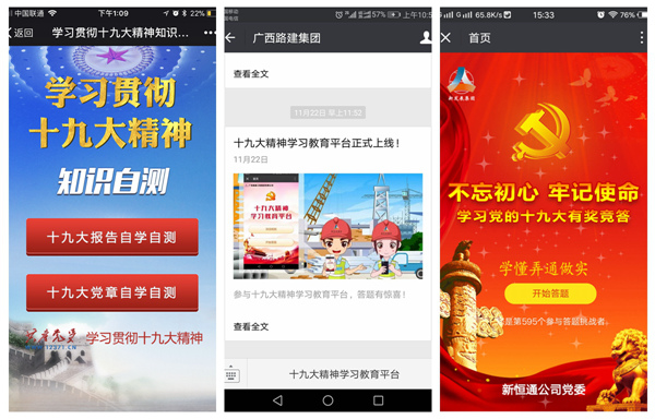 而廣西路建集團、新恒通公司等直屬企業(yè)微信公眾號也開辟了十九大精神學(xué)習(xí)教育平臺,開創(chuàng)性地把知識性較強的黨建知識競答與趣味性十足的搶紅包結(jié)合到一起,寓教于樂,大大激發(fā)了廣大黨員干部和企業(yè)員工的學(xué)習(xí)積極性。