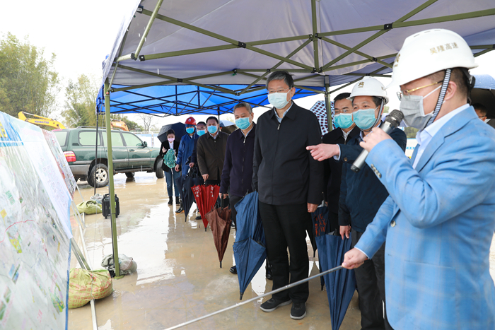 自治區(qū)副主席費志榮(右四)到吳隆路施工現(xiàn)場調研交通項目復工建設情況