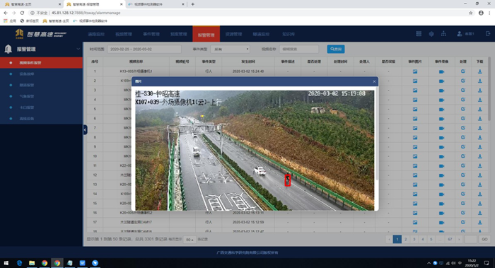 近日,昭平運營管理中心智慧高速軟件平臺引入了“人工智能事件檢測報警系統(tǒng)”。該系統(tǒng)采用了人工智能深度學習技術,在鐘昭高速每2公里一個監(jiān)控攝像機的硬件基礎上,能夠實現鐘昭高速全線事件檢測全面覆蓋,快速發(fā)現路上異常情況并發(fā)出警報。